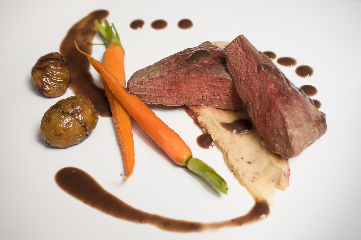Kurzgebratenes vom Rehrücken auf Maronen-Kartoffelpüree mit karamellisierten Möhren